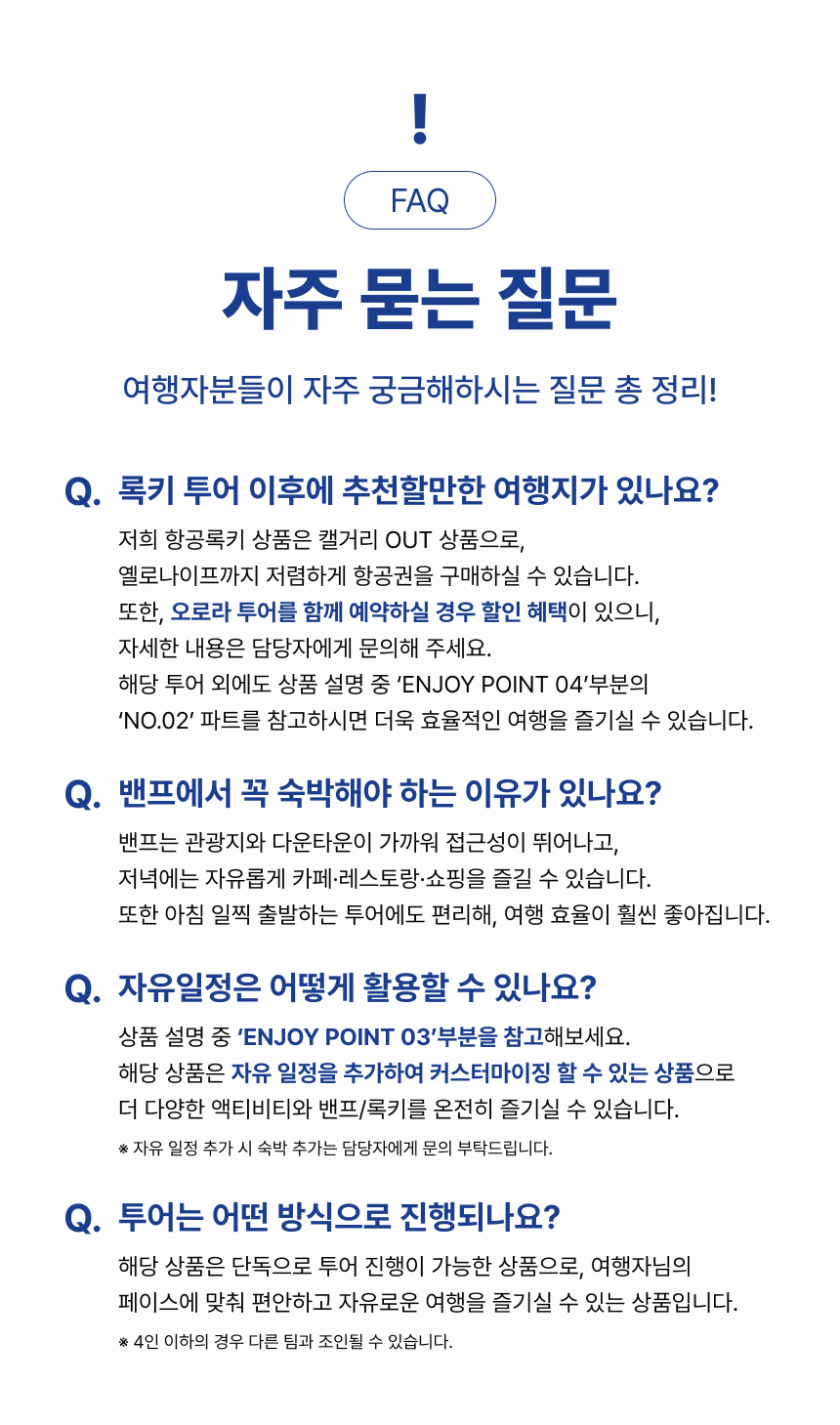 유의사항 | • 상기 일정은 현지의 사정에 의해 사전 통지 없이 변경될 수 있습니다. • 여행 중 발생될 수 있는 분실 및 안전사고에 대하여 본사는 책임이 없음을 알려드리오니, 귀중품 및 현금 등의 분실사고와 개인의 안전사고에 대하여 각별히 유의하여 주시기 바랍니다. • 여행자보험은 불포함이므로 개인적으로 준비하셔야 합니다. • 투어 진행시 인원에 따라 그에 적합한 차량이 배정될 수 있습니다. • 투어차량 탑승시 투어당일 탑승지에 도착한 순서대로 탑승합니다. • 모든 선택관광은 필수가 아닌 원하시는 것만 선택 진행이 가능하며, 개별적으로 티켓을 구매하여 사용하는 것은 불가능합니다. • 캐나다 입국 시 필요한 비자 및 서류 등은 반드시 개별 부탁드립니다. 입출국 서류 준비 누락으로 인해 투어 진행 불가능할 경우 당사에서 책임 질 수 없기에 반드시 개별 준비 부탁드립니다. • 호텔은 예약 시점 및 현지 사정에 따라 일정표 상 안내 된 호텔 또는 동급 호텔로 사전안내 없이 대체 될 수 있습니다. • 호텔 객실 상황에 따라 객실 내 침대가 1 King Bed 객실로 배정될 수 있는 점 참고 바랍니다. • 4인 이하의 경우 다른 팀과 조인될 수 있습니다. |